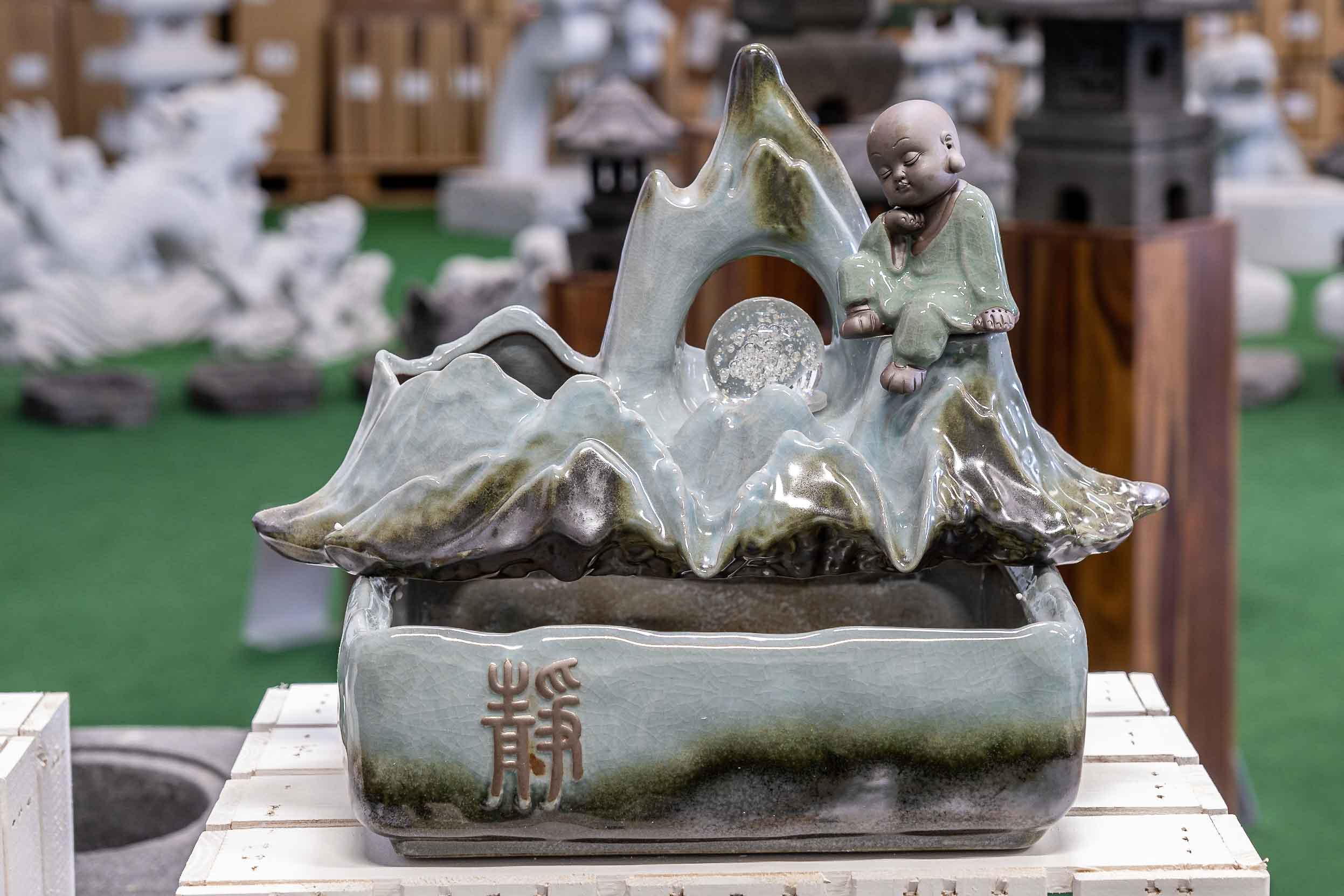 Zimmerbrunnen aus Keramik | Wasserspiel für besseres Raumklima |komplett mit Pumpe | Asiatische Richtung | Maße: 39 x 28 x 30 cm |Entspannung zu Hause